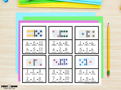 Using dominoes always feels like a game! Students choose a domino and write an addition sentence to match, Then, they flip the domino over and write the turn-around. You can use a recording sheet so they can prove both equations have the same sum. It’s simple, hands-on, and reinforces fact fluency.